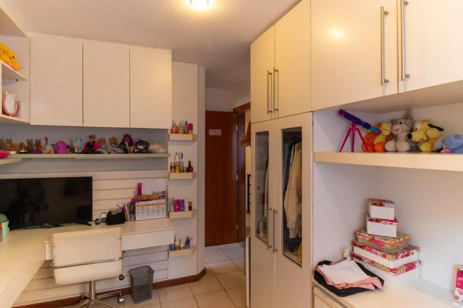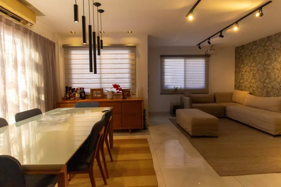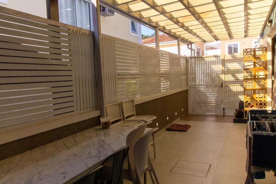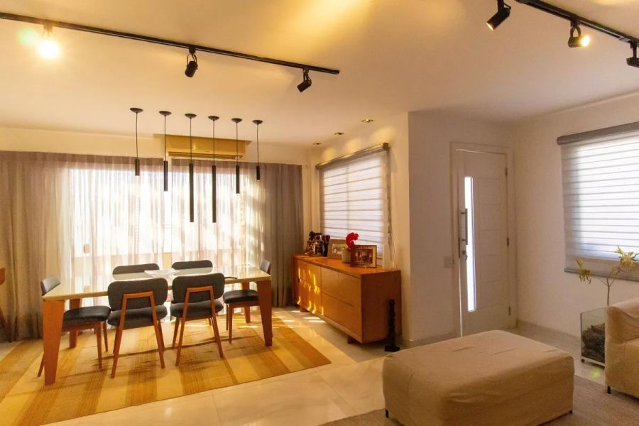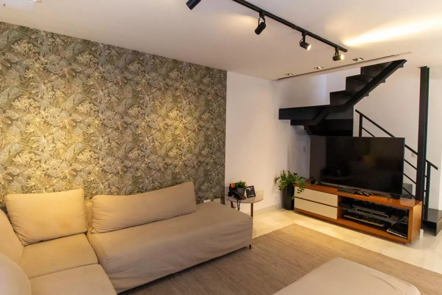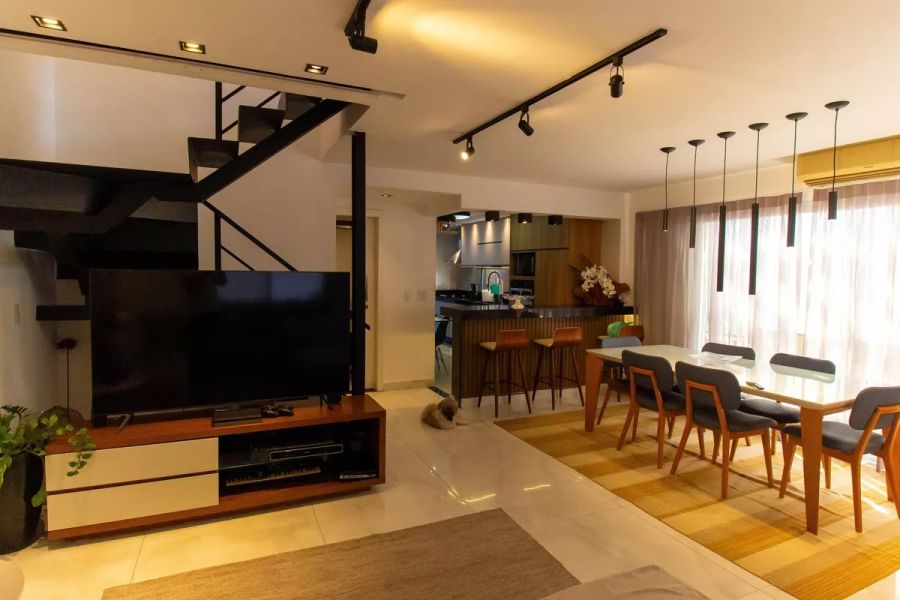 O imóvel, configurado como casa duplex, apresenta uma planta inteligente e funcional. Composta por 4 dormitórios, sendo 2 suítes, a residência oferece privacidade e conforto para grandes famílias. São 5 banheiros no total, atendendo tanto à área íntima quanto social. O living é dividido em duas salas amplas, integradas a uma cozinha americana moderna, otimizando o convívio social. A unidade é entregue semimobiliada e pronta para morar, reduzindo custos imediatos de ocupação ou adaptação.