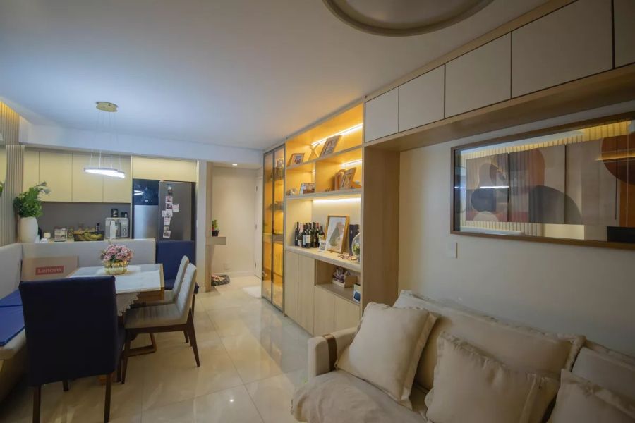 Com uma área privativa de 85 m², o imóvel possui uma planta inteligente e otimizada. A unidade é composta por três dormitórios, sendo uma suíte, projetados para oferecer conforto e privacidade. O ambiente social integra uma sala ampla a uma cozinha americana moderna, favorecendo a convivência e a funcionalidade. O imóvel é entregue semimobiliado, o que representa uma economia imediata e agilidade para ocupação.